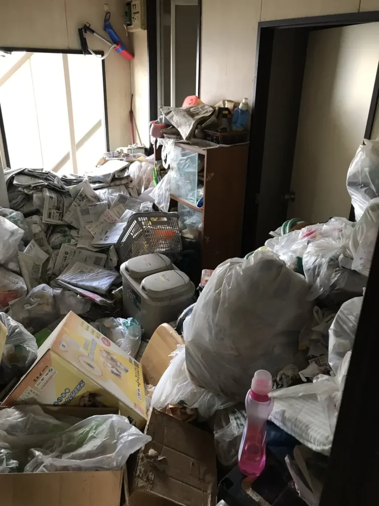 太田市にて、ゴミ屋敷化してしまったお部屋の片付けをご依頼いただきました。室内には袋ごみ・紙類・日用品が多く、動線が塞がっている状態。ハピネスサポートでは、分別から搬出までまとめて対応し、作業後は床が見える状態(空室に近い状態)まで回復しました。